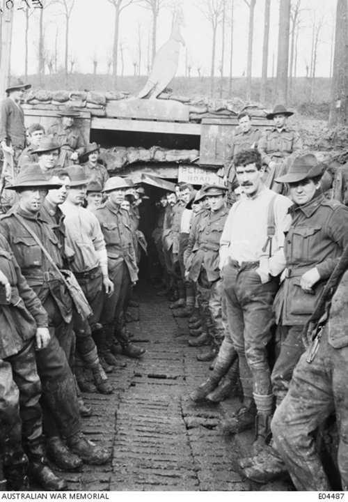 E04487 - 22 January 1918 - Messines Area, Belgium. An outdoors informal group portrait of unidentified members of 7th Field Company of Australian Engineers standing outside the entrance to the Catacombs in Hill 63. The Catacombs were a system of tunnels of considerable length, fitted to accommodate over 1,000 men. A wooden silhouette of a kangaroo is attached to the tunnel entrance which is signposted 'Plumer Road'.