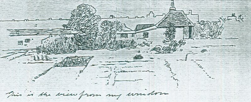 It is a heavenly day and I have wandered along for the last ½ hour looking dreamily for a place to sit down and enjoy the quiet beauty of everything. I've found the corner of a ploughed field which offers a square yard sufficiently hard & dry to sit on without getting rheumatism. The air is milky soft and a copse of trees near looms up mysteriously with here and there shaky twirls and shivers of sunlight trimming its edges. The earth is chocolate brown where it has been newly turned. In the near distance are quaint red roofed cottages & ricks & lopped elms of queer shapes shading them. The bean fields have been harvested & the beans are looped up in bunches on long poles.