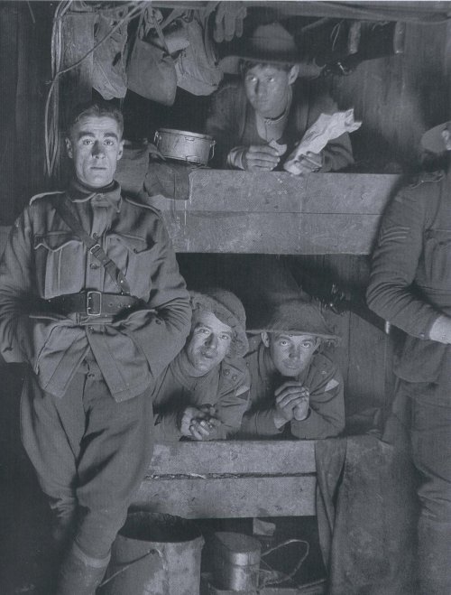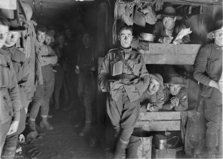 E01509 - 22 January 1918 - Officers of the 6th Australian Infantry Brigade in their billets at the "Catacombs" beneath Hill 63. During the winter of 1917, from December 1917 to March 1918, the battalion used the Catacombs as a reserve position after coming out from the front line at Warneton. From here working parties were nightly sent to the front line area for construction of earthworks. Identified: Lieutenant (Lt) R. L. Keig (standing, left); Private J. Harrison (top bunk); Lt G. O. Pollington MC MM (bottom bunk, left); Lt H. Clough MC MM (bottom bunk, right). All are members of the 24th Battalion.
