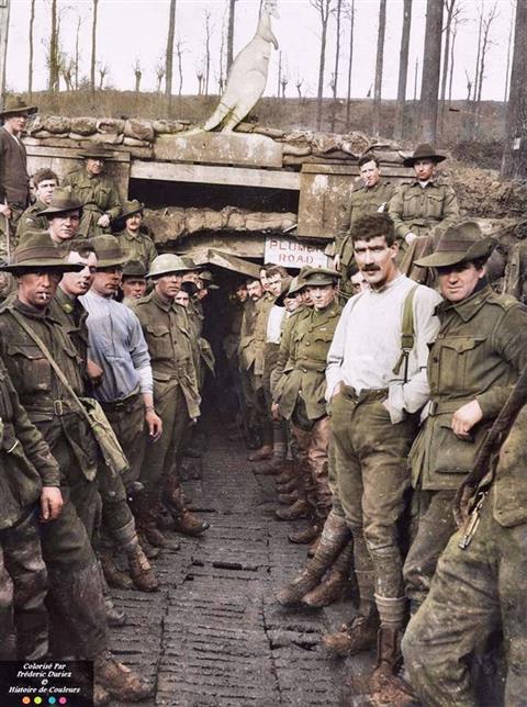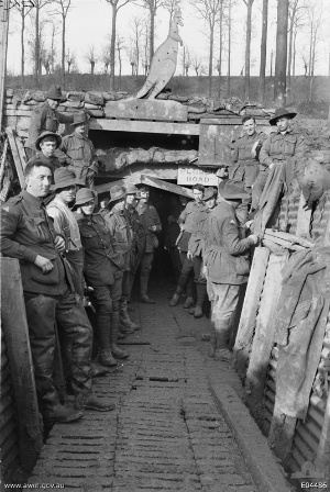 E04487 - 22 January 1918 - Messines Area, Belgium. An outdoors informal group portrait of unidentified members of 7th Field Company of Australian Engineers standing outside the entrance to the Catacombs in Hill 63. The Catacombs were a system of tunnels of considerable length, fitted to accommodate over 1,000 men. A wooden silhouette of a kangaroo is attached to the tunnel entrance which is signposted 'Plumer Road'.
